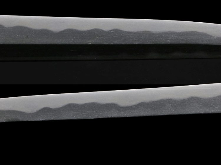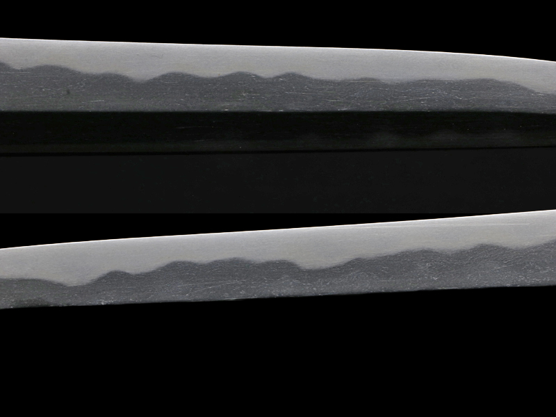The hamon is in a gunome pattern with areas of tobiyaki.
