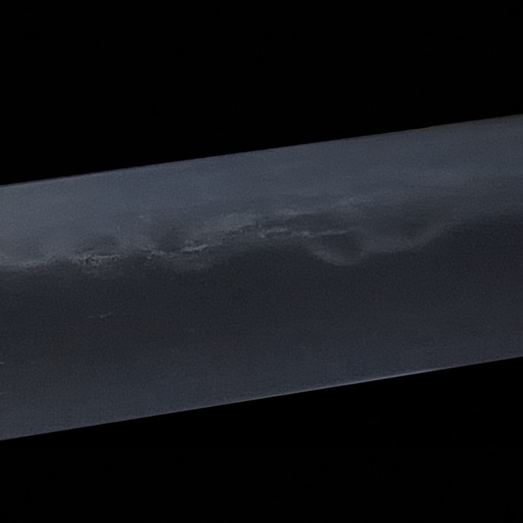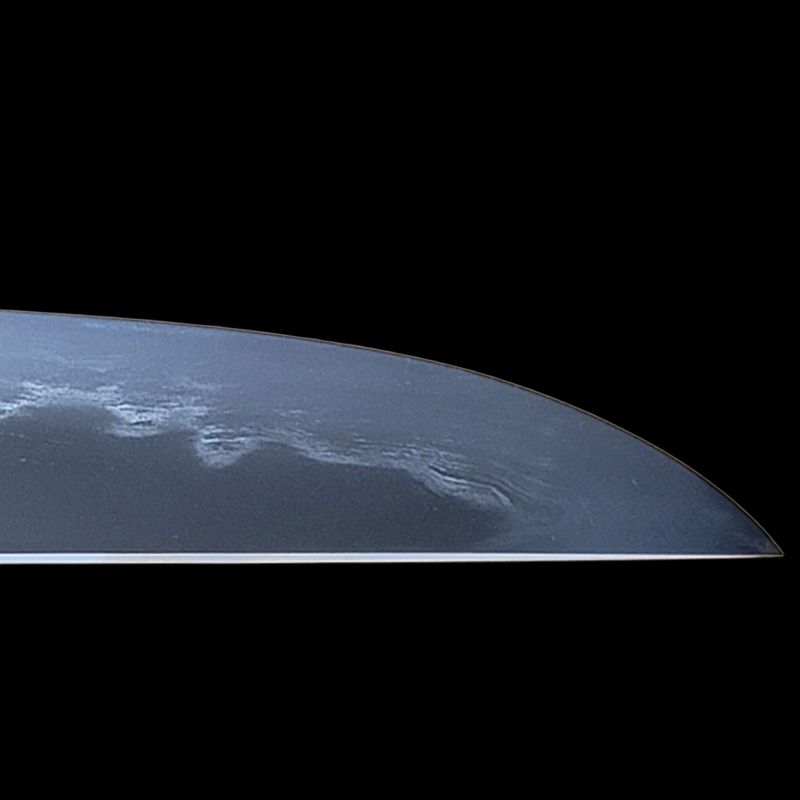 This piece is a robust tantō with a wide and powerful shape, forged with a well-forged and tightly packed itame-hada, and tempered in an active gunome-midare hamon. The condition of the blade is good.