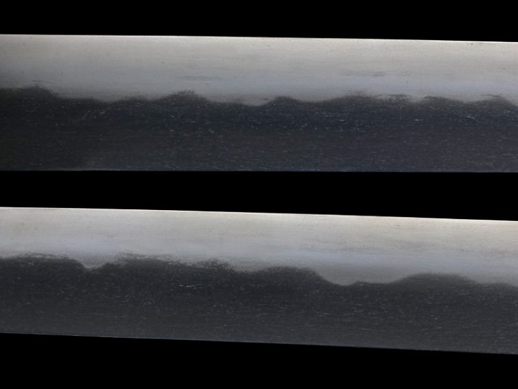 The jigane (surface steel) shows flowing itame-hada (wood-grain pattern) with thick ji-nie (abundant fine crystalline particles).